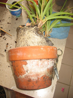 Although I really don't like cutting roots, it is one way to stimulate new growth and had to be done to get these plants apart. And this potted group of plants would probably have started to suffer, as a result of being so bound. After splitting, I potted the parts into to pots using fresh potting soil.